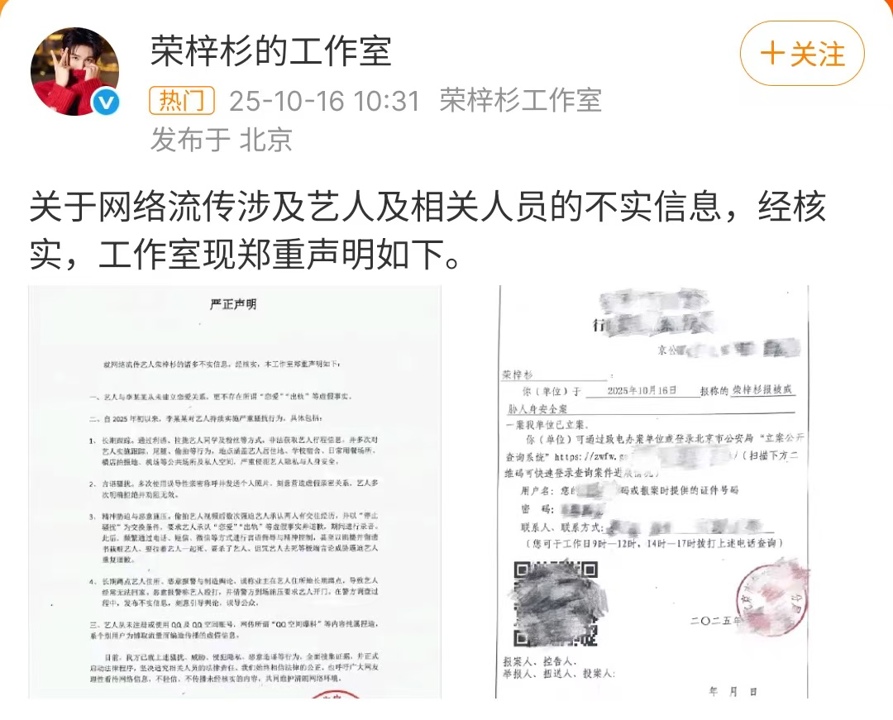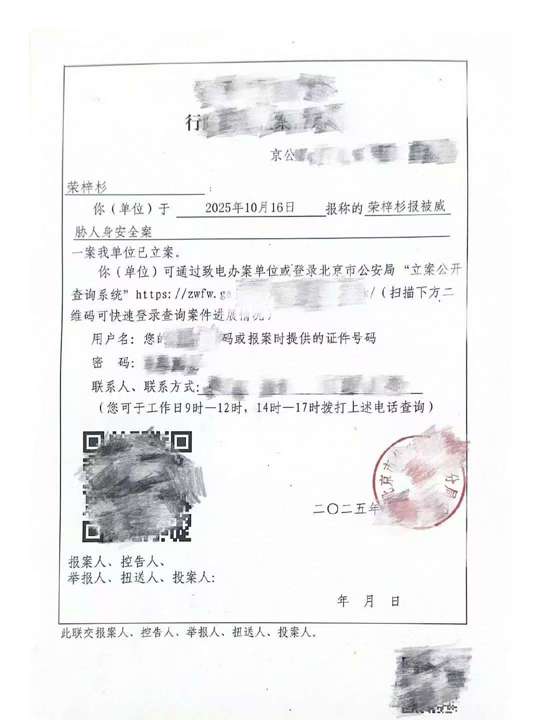 刚刚,荣梓杉工作室发布郑重声明否认指控,并称与李某某从未建立恋爱关系,今年初以来,李某某对荣梓杉持续实施严重骚扰行为,目前已启动法律程序。工作室发布的图片显示,警方已就“荣梓杉报被威胁人身安全案”立案。